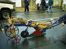 A plough being pulled through the streets of Whittlesey as part of the Whittlesey Straw Bear Festival procession. Ploughs were traditionally taken around by Plough Monday mummers and molly dancers in parts of Eastern England and in some places were used as a threat: if householders refused to donate to the participants their front path would be ploughed up.[3]