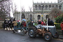 As well as a ploughshare, in rural areas, it is common for local farmers to attend the service with their tractors - both new and old (see photo). Sometimes, services may be accompanied by other traditions such as Morris dancing.[4] Historically, villagers would walk through their village collecting alms, before gathering at the church for the Blessing of the Plough.[5]