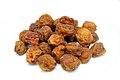 The taste of the plum fruit ranges from sweet to tart; the skin itself may be particularly tart. It is juicy and can be eaten fresh or used in jam-making or other recipes. Plum juice can be fermented into plum wine. In central England, a cider-like alcoholic beverage known as plum jerkum is made from plums. Dried, salted plums are used as a snack, sometimes known as saladito or salao. Various flavors of dried plum are available at Chinese grocers and specialty stores worldwide. They tend to be much drier than the standard prune. Cream, ginseng, spicy, and salty are among the common varieties. Licorice is generally used to intensify the flavor of these plums and is used to make salty plum drinks and toppings for shaved ice or baobing. Pickled plums are another type of preserve available in Asia and international specialty stores. The Japanese variety, called umeboshi, is often used for rice balls, called onigiri or omusubi. The ume, from which umeboshi are made, is more closely related, however, to the apricot than to the plum. In the Balkans, plum is converted into an alcoholic drink named slivovitz (plum brandy) (Serbian: šljivovica).[11][12] A large number of plums, of the Damson variety, are also grown in Hungary, where they are called szilva and are used to make lekvar (a plum paste jam), palinka (traditional fruit brandy), plum dumplings, and other foods. In Romania, 80% of the plum production is used to create a similar brandy, called țuică.[13]