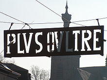 The motto is first recorded on the back of Charles's chair in the church of St Gudule, Brussels.[2] The original French motto Plus oultre was translated into Latin due to the hostility Spaniards bore for the French advisors and ministers Charles brought with him to Spain.[2]