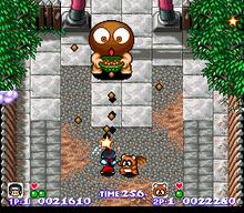 Pocky & Rocky is a scrolling shooter video game that takes place from a top-down perspective.[6] The screen can move either horizontally or vertically and the player-controlled characters can move in eight directions.[1] The game features six levels and allows its players to continue indefinitely.[7][8] In single-player mode, the player can choose to play as either Pocky or Rocky. In two-player cooperative mode, both characters are on the screen at the same time.[8]