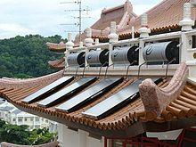 The temple takes advantage of Singapore's abundant sunlight by having three different kinds of solar energy cells on its rooftop. They are the poly-crystalline silicon solar array, mono-crystalline silicon solar array and amorphous silicon solar array. Poh Ern Shih's water is heated by its solar panels, and its night lighting is powered by electricity converted from solar energy, With its breezy location, wind generators have also been erected to convert wind activity into electricity.[11]