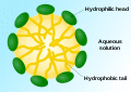 A micelle – the lipophilic ends of the surfactant molecules dissolve in the oil, while the hydrophilic charged ends remain outside in the water phase, shielding the rest of the hydrophobic micelle. In this way, the small oil droplet becomes water-soluble.