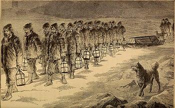 Resigned to the ice, the Inuit soon had igloo shelters built, and Tyson estimated that they had 1,900 pounds (860 kg) of food.[57] They also had the ship's two whaleboats and two kayaks, although one kayak was soon lost during a breakup of the ice.[58] Meyer reckoned that they were drifting on the Greenland side of the Davis Strait and would soon be within rowing distance of Disko Island. He was incorrect; the men were actually on the Canadian side of the strait. The error caused the men to reject Tyson's plans for conserving. The seamen soon broke up one of the whaleboats for firewood, making a safe escape to land unlikely.