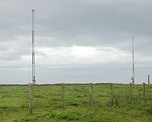 To design the spark transmitter, the first high power radio transmitter in the world, Marconi hired Prof. John Ambrose Fleming, University College, London.[5] The original twenty mast circular aerial was destroyed in a storm on 17 September 1901.[5][6][7] Marconi hastily built a temporary aerial of 50 wires suspended in a fan shape from a cable between two 200 foot (61 m) masts.[8] Fleming estimated the transmitter's radiated power was around 10–12 kW.[9] The frequency used is not known precisely, as Marconi did not measure wavelength or frequency, but it was between 166 and 984 kHz, probably around 500 kHz.[5] After the experiment the original mast layout was not rebuilt, it was replaced with a four mast design, 215 feet (66 m) high and forming a 200 foot (61 m) square.