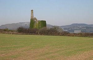 In the late eighteenth century shareholders or 'adventurers' in the mines included the engineers James Watt (who may have lived in Polgooth for a time) and Matthew Boulton, the industrialist John Wilkinson, local entrepreneur Charles Rashleigh (who built the port of Charlestown, from which much of the tin was shipped), landowner Lord Henry Arundell, and the potters Josiah and John Wedgwood.[8][9] By 1800, over 1000 people were employed at Polgooth though, judging by a contemporary visitor, not in the most cheerful of conditions: "The shafts...are scattered over a considerable extent of sterile ground, whose dreary appearance, and the sallow countenances of the miners, concur to excite ideas of gloom, apprehension, and melancholy."[10]
