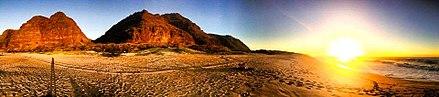 Polihale State Park is a remote wild beach on the western side of the Hawaiian island of Kauai. It is the most western publicly accessible area in Hawaii, although the privately owned island of Niihau is further west. The park is miles away from the town of Kekaha, and it can only be reached via a poorly marked, dirt sugarcane road, making a four-wheel drive vehicle preferable. The beach is several miles long, yet only the area known as "Queen's Pond" offers safe swimming.