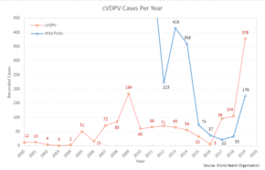 A potential, adverse effect of the OPV is its known ability to recombine to a form that causes neurological infection and paralysis.[22] This genetic reversal of the pathogen to a virulent form takes a considerable time (at least 12 months) and does not affect the person who was originally vaccinated. The vaccine-derived attenuated virus is normally excreted from vaccinated people for a limited period. Thus, in areas with poor sanitation and low vaccination coverage, the spontaneous reversal of the vaccine-derived virus to a virulent form and its spreading in the environment can lead to unvaccinated people becoming infected.[23] Clinical disease, including paralysis, caused by vaccine-derived poliovirus (VDPV) is indistinguishable from that caused by wild polioviruses.[24] Outbreaks of vaccine-associated paralytic poliomyelitis (VAPP), caused by a circulating vaccine-derived poliovirus (cVDPV),[25] have been reported, and tend to occur in areas of low coverage by OPV, presumably because the OPV is itself protective against the related outbreak strain.[26][27] With wild polio cases at record lows, 2017 was the first year where more cases of cVDPV were recorded than the wild poliovirus, a trend that is expected to continue.[28]