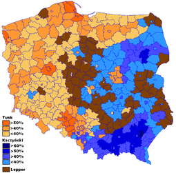 Two center-right candidates, Donald Tusk, chairman of the Civic Platform (PO) and Deputy Marshal of the Sejm, and Lech Kaczyński, honorary chairman of Law and Justice (PiS) and mayor of Warsaw, led the poll in the first round, as was widely expected. As neither received 50 percent of the vote, a second-round was held on 23 October. In this round, Kaczyński defeated Tusk, polling 54.04 percent of the vote.