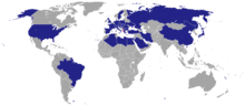 Foreign policy are conducted through the Ministry of Foreign Affairs in Tirana. Albania maintains a network of 50 diplomatic missions abroad and holds relations with more than 115 countries.[24] It is a member of the North Atlantic Treaty Organization (NATO), United Nations (UN), Council of Europe, International Monetary Fund (IMF), World Bank and several others. The citizens of the country has a visa-free or visa on arrival access to 98 countries and territories, ranking the Albanian passport 55th in terms of travel freedom according to the Henley visa restrictions index.[25] Today, Albania maintains strong diplomatic relations with countries like United States, Italy, Brazil, Greece, Austria, Croatia, China, Germany, Portugal, United Kingdom, Turkey, Kuwait and Switzerland.