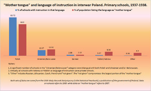 Before 1921, there were 514 Belarusian language schools in West Belarus.[66] In 1928, there were only 69 schools which was just 3% of all existing schools in West Belarus at that moment.[67] All of them were phased out by the Polish educational authorities by 1939.[68] The Polish officials openly prevented the creation of Belarusian schools and were imposing Polish language in school education in West Belarus.[69] The Polish officials often treated any Belarusian demanding schooling in Belarusian language as a Soviet spy and any Belarusian social activity as a product of a communist plot.[70]