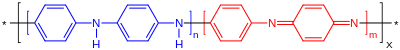 In the figure, x equals half the degree of polymerization (DP). Leucoemeraldine with n = 1, m = 0 is the fully reduced state. Pernigraniline is the fully oxidized state (n = 0, m = 1) with imine links instead of amine links. Studies have shown that most forms of polyaniline are one of the three states or physical mixtures of these components. The emeraldine (n = m = 0.5) form of polyaniline, often referred to as emeraldine base (EB), is neutral, if doped (protonated) it is called emeraldine salt (ES), with the imine nitrogens protonated by an acid. Protonation helps to delocalize the otherwise trapped diiminoquinone-diaminobenzene state. Emeraldine base is regarded as the most useful form of polyaniline due to its high stability at room temperature and the fact that, upon doping with acid, the resulting emeraldine salt form of polyaniline is highly electrically conducting.[5] Leucoemeraldine and pernigraniline are poor conductors, even when doped with an acid.
