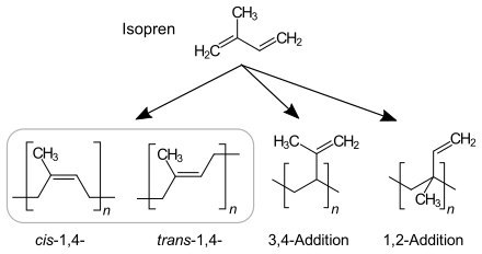 Coordinative chain polymerization: With Ziegler–Natta catalyst TiCl4/Al(i-C4H9)3, a more pure cis-1,4-polyisoprene similar to natural rubber is formed. With Ziegler–Natta catalyst VCl3/Al(i-C4H9)3, trans-dominant polyisoprene is formed.[3]