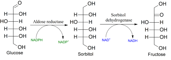 The polyol pathway is a two-step process that converts glucose to fructose.[1] In this pathway glucose is reduced to sorbitol, which is subsequently oxidized to fructose. It is also called the sorbitol-aldose reductase pathway.
