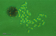 Polysomy plays a role in canine leukemia, hemangiopericytomas, and thyroid tumors.[12] Abnormalities of chromosome 13 have been observed in canine osteoid chondrosarcoma and lymphosarcoma.[13] Trisomy 13 in dogs with lymphosarcoma show a longer duration of first remission (medicine) and survival, responding well to treatments with chemotherapeutic agents.[14] Polysomy of chromosome 13 (Polysomy 13) is significant in the development of prostate cancer and is often caused by centric fusions.[12] Since canine chromosome 13 is similar to human chromosome 8q, research could provide insight to treatment for prostate cancer in humans.[15] Polysomy of chromosomes 1, 2, 4, 5, and 25 are also frequently involved in canine tumors.[16] Chromosome 1 may contain a gene responsible for tumor development and lead to changes in the karyotype, including fusion of the centromere, or centric fusions.[16] Aneuploidy due to nondisjunction is a common feature in tumor cells.[17]