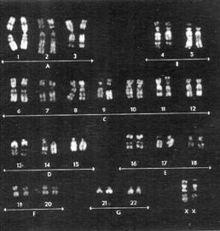 Germ line cells develop into eggs and sperm and the associated inherited material can be passed down to future generations.[32] As shown in the associated karyotype image, chromosomes 1–22 are grouped A-G. A population of male grasshoppers (Chorthippus binotatus) from the Sierra Nevada (Spain) are polysomic mosaics (coming from cells of two genetically different types) possessing an extra E group chromosome(chromosomes 16, 17 & 18) in their testicles.[33] Parents that exhibited polysomy did not pass the E chromosome abnormality to any of the offspring, so this is not something that is passed down to future generations.[33] Male grasshoppers (Atractomorpha similis) from Australia carry between one and ten extra copies of chromosome A9, with one being the most common in natural populations.[34] Most polysomic males produce normal sperm. However, polysomy can be transmissible through both the male and female parents through nondisjunction.[34]