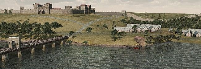 The bridge and its fort were built at the north end of Cade's Road, which is speculated to have run from Brough (East Riding of Yorkshire), to Eboracum (York) and the fort of Concangis (Chester-le-Street). Although the fort was to be the wall's east end, it was not long before the wall was extended to Segedunum (Wallsend). There is evidence to suggest the fort was rebuilt in stone, probably during the reign of the emperor Septimius Severus (r. 193–211).[3]