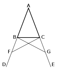 There are two possible explanations for the name pons asinorum, the simplest being that the diagram used resembles an actual bridge. But the more popular explanation is that it is the first real test in the Elements of the intelligence of the reader and functions as a "bridge" to the harder propositions that follow.[14] Gauss supposedly once espoused a similar belief in the necessity of immediately understanding Euler's identity as a benchmark pursuant to becoming a first-class mathematician.[15]