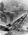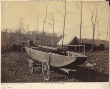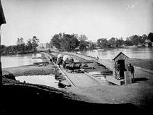 During the American Civil War various forms of pontoon bridges were tried and discarded. Wooden pontoons and India rubber bag pontoons shaped like a torpedo proved impractical until the development of cotton-canvas covered pontoons, which required more maintenance but were lightweight and easier to work with and transport.[34] From 1864 a lightweight design known as Cumberland Pontoons, a folding boat system, were widely used during the Atlanta Campaign to transport soldiers and artillery across rivers in the South.