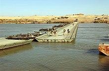 The United States Army's 299th Multi-role Bridge Company, USAR deployed a Standard Ribbon Bridge across the Euphrates River at Objective Peach near Al Musayib on the night of 3 April 2003. The 185-meter bridge was built to support retrograde operations because of the heavy-armor traffic crossing a partially destroyed adjacent highway span.[52]