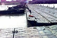 A floating bridge can be built in a series of sections, starting from an anchored point on the shore. Modern pontoon bridges usually use pre-fabricated floating structures.[14]