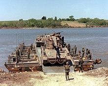 "By dawn on 4 April 2003, the 299th Engineer Company had emplaced a 185-meter long Assault Float Bridge—the first time in history that a bridge of its type was built in combat."[53] This took place during the 2003 invasion of Iraq by American and British forces. That same night, the 299th also constructed a 40-metre (130 ft) single-story Medium Girder Bridge to patch the damage done to the highway span. The 299th was part of the U.S. Army's 3rd Infantry Division as they crossed the border into Iraq on 20 March 2003.