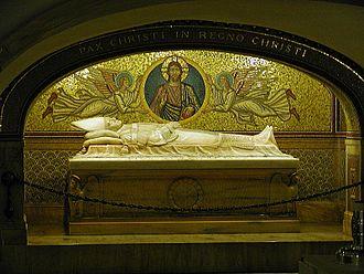 Pius XI died on 10 February 1939 in the Apostolic Palace and is buried in the Papal Grotto of Saint Peter's Basilica. In the course of excavating space for his tomb, two levels of burial grounds were uncovered which revealed bones now venerated as the bones of St. Peter.[5][6][7]