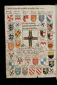 Several armorials of the 15th and early 16th century depict the coat of arms of the grand masters. These include the Chronica by Ulrich Richenthal,[12] an armorial of St. Gallen kept in Nuremberg,[13] an armorial of southwest Germany kept in Leipzig[14] and the Miltenberg armorial.[15] Conspicuously absent from these lists are three grand masters, Gerhards von Malberg (1241-1244) and his successors Heinrich von Hohenlohe (1244-1249) and Gunther von Wüllersleben (1250-1252), so that pre-modern historiographical tradition has a list of 34 grand masters for the time before 1525 (as opposed to 37 in modern accounts).[16]