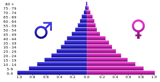 A population pyramid, also called an "age-gender-pyramid", is a graphical illustration that shows the distribution of various age groups in a population (typically that of a country or region of the world), which forms the shape of a pyramid when the population is growing.[1] Males are conventionally shown on the left and females on the right, and they may be measured by raw number or as a percentage of the total population. This tool can be used to visualize the age of a particular population.[2] It is also used in ecology to determine the overall age distribution of a population; an indication of the reproductive capabilities and likelihood of the continuation of a species.