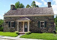 The smaller monument, the Tri-States Monument, also known as the Tri-State Rock, marks both the northwest end of the New Jersey and New York boundary and the north end of the New Jersey and Pennsylvania boundary.[19] It is a small granite block with inscribed lines marking the boundaries of the three states and a bronze National Geodetic Survey marker.[20] Both monuments were erected in 1882.[18]