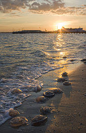 Port Phillip Bay has lost over 95% of native flat oyster and blue mussel reefs since European settlement.[45] In 2014 the Port Phillip Shellfish Reef restoration project set about restoring shellfish reefs at two locations off Hobsons Bay near St Kilda, and off Corio Bay near Avalon. 300,000 native Angasi oysters were laid on limestone rubble over a 600 square metre area. The project aimed to improve marine biodiversity, water quality and fish habitat.[46][47][48]