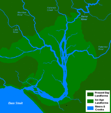 Port Phillip formed between the end of the last Ice Age around 8000 BCE and around 6000 BCE,[2] when the sea-level rose to drown what was then the lower reaches of the Yarra River, vast river plains, wetlands and lakes. The Yarra and other tributaries flowed down what is now the middle of the bay, formed a lake in the southern reaches of the bay, dammed by The Heads, subsequently pouring out into Bass Strait.[3]