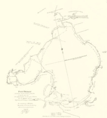 About ten weeks after Murray, Matthew Flinders in HMS Investigator also found and entered the bay,[13] unaware Murray had been there. The official history of Nicholas Baudin's explorations in Le Géographe claimed they too had sighted the entrance at that time (30 March 1802) but this is almost certainly a later embellishment or error, being absent from the ship's logs and Baudin's own accounts.[17] As a result of Murray's and Flinders' reports, King sent Lieutenant Charles Robbins in HMS Cumberland to explore Port Phillip fully. This surveying party, which included Charles Grimes, produced a mostly complete chart of Port Phillip including the mouth of the Yarra River, which they visited on 2 February 1803. Robbins found Aboriginal habitations and groups of Aboriginal people at Tootgarook, Carrum Carrum, on the banks of the Yarra and at Geelong.[18]
