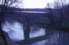 There are also the remains of a covered bridge that was damaged during a flood during the early 2000s. Due to a lack of funding, the bridge was never repaired. This bridge dates from 1978 and was a 75% scale recreation of a bridge from 1904. This bridge is not accessible to the public but one can see the remains of the stone piers, which are original to the 1904 bridge. The stone in the piers originally came from the Port Royal Mills and dam which dates back to circa 1800.