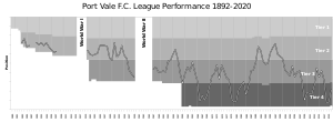 The club were relegated for the first time at the end of the 1928–29 season, going from the Second Division to the Third Division North.[18] They came up as champions the following season and in the 1930–31 season were placed fifth in the second tier of English football, their highest ever league finish.[19] Vale went to beat Chesterfield by a club record 9–1 margin on 24 September 1932.[20] However, after these achievements the club were once again relegated in the 1935–36 season and remained in the third tier until World War II.[21]