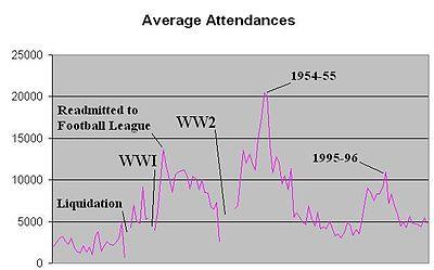 The club has a fierce rivalry with Stoke City, as City are based in the town of Stoke-upon-Trent, but only a small percentage of residents in the town are Vale fans. Stoke City also enjoy a higher support base in the city as a whole, especially in recent times when they have achieved promotion to the country's top division. With 215,206 supporters turning out in 46 League Two games during the 2009–10 season, Vale attracted an average league attendance of 4,678.[72] Stoke and Vale first met on 2 December 1882, and played out a total of 44 Football League games up until 10 February 2002, when the two clubs last met in the Second Division; Stoke won the first match 1–0, whilst Vale were 1–0 victors in the latest encounter.[73] Stoke have been the more successful team over the years, as Vale have finished higher in the league on only seven occasions.[73]