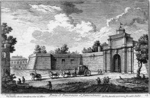 One of the relevant characteristics of the 14th Region, where the gate rose, was that Via Aurelia vetus passed through it: the street started from Pons Aemilius, climbed the hill and exited from the town just through the gate, that took its name from the street (even now, the present Via Aurelia Antica, having lost its stretch within Trastevere, starts here). For this reason, the former name of the gate was Porta Aurelia,[1] though the denominations Gianicolense or Aureliana - from the name of the consul that conceived and built the road - are attested. The importance of the near sepulchre of the Christian martyr Pancras, of the catacomb consecrated to him and later of the Basilica, destinations of continual pilgrimages, became so much prevalent along the consular street, as to influence - just like in many other cases - the process of Christianization of the nomenclature of the Roman gates, and since the 6th century the gate was bestowed the name it maintains to this day.[2]