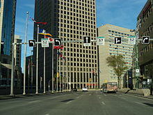Portage and Main is an intersection in the city of Winnipeg, Manitoba, Canada. It is located in downtown Winnipeg where Portage Avenue (Route 85) and Main Street (Route 52) intersect. The corner is known as the "crossroads of Canada", due to its relative proximity to the longitudinal centre of Canada.