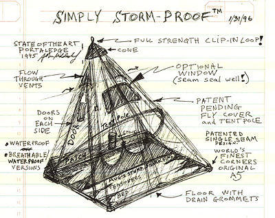 In 1986, John Middendorf, a Stanford-trained mechanical engineer, founded A5 Adventures. Previously, Middendorf and his companions Steve Bosque and Mike Corbett had nearly died due to portaledge failure during a three-day storm on the 2000 foot South Face of Half Dome, prompting Middendorf to redesign the modern portaledge.[2] A5 portaledges were constructed of highly weatherproof fabrics and engineered to be structurally stable and strong. The company produced three models: the Single, the Alpine Double, and the Cliff Cabana. The A5 portaledges were the first that could withstand the severe weather conditions in remote areas such as the Himalayas and the Karakoram, enabling climbers to expand their horizons to the largest rock faces in the world. Middendorf himself used A5 portaledges on some of the hardest and remote big walls of the world, including during the first ascent of The Grand Voyage on the Great Trango Tower in 1992, the longest vertical big wall (1350m) in the world. The A5 Portaledge was sold worldwide.