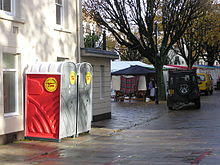 Chemical toilets are a type of portable toilet and are also known by various tradenames, such as Port-a-John and Porta-Potty (American English), Portaloo (British English), or honey bucket. The last two are the names of companies[3] and "Portaloo" is a British and European Community registered trade mark.[4]