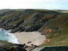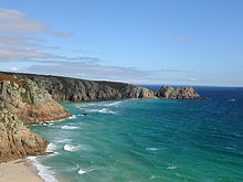 Porthcurno beach and bay, a few hundred yards south of the village is situated in the shelter of the Logan Rock headland just less than one mile (1.6 km) to the east. The beach is noted for its sand of crushed, white sea shells, privacy and isolation rather than movement of ships.[26][27][28] Porthcurno Bay has been described as "floored by glorious white sand that shines through translucent water".[29] Sometimes combinations of wind, tides and sea currents can change the 'sandscape' dramatically in a few hours, but the volume of sand is sufficient that it is unusual for the beach to be completely inundated by the sea at high tide. To the immediate east of Porthcurno beach, on the other side of Percella Point is a small tidal beach called Green Bay. Sometimes this is accessible with caution from Porthcurno beach at low tide.[3]