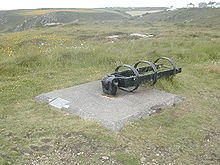 During the Second World War, Porthcurno was designated a Vulnerable Point and was heavily defended and fortified as a part of British anti-invasion preparations. At the beginning of the war a small guard of special constables was put on duty at the cable office and cable house, later superseded by a platoon of soldiers who camped on a former bowling green.[12] Porthcurno valley was declared a protected place and as many as 300 troops were deployed in the immediate area to guard the station.[42] Passes were issued to residents and visitors who had business to be in the area and many mock attacks were staged.[43] The defences included pillboxes and a petroleum warfare beach flame barrage[44] which could be operated remotely from the tunnel.[42] At the end of the War, although some 867 bombs fell in the (Penzance) area and 3957 houses were damaged or destroyed, the only damage suffered by any communications equipment at Porthcurno was the destruction of an antenna when a bomb fell at Rospletha Farm, located at the top of the hill about half a mile to the west of the cable office.[12]