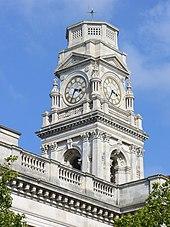 There are five bells in its bell tower, collectively nicknamed The Pompey Chimes, as they inspired the football chant of the same name.[10] The largest of the five bells, Victoria is named after Queen Victoria and is inscribed with her name, and chimes on the hour.[11] The four quarter bells chime at 15, 30 and 45 minutes past the hour and play the Westminster Quarters, just before Victoria tolls on the hour.[12]