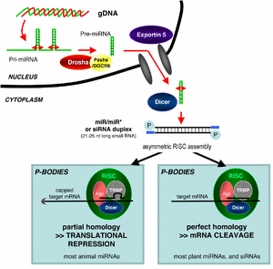 MicroRNAs (miRNAs) are genomically encoded non-coding RNAs that help regulate gene expression, particularly during development.[19] The phenomenon of RNA interference, broadly defined, includes the endogenously induced gene silencing effects of miRNAs as well as silencing triggered by foreign dsRNA. Mature miRNAs are structurally similar to siRNAs produced from exogenous dsRNA, but before reaching maturity, miRNAs must first undergo extensive post-transcriptional modification. A miRNA is expressed from a much longer RNA-coding gene as a primary transcript known as a pri-miRNA which is processed, in the cell nucleus, to a 70-nucleotide stem-loop structure called a pre-miRNA by the microprocessor complex. This complex consists of an RNase III enzyme called Drosha and a dsRNA-binding protein DGCR8. The dsRNA portion of this pre-miRNA is bound and cleaved by Dicer to produce the mature miRNA molecule that can be integrated into the RISC complex; thus, miRNA and siRNA share the same downstream cellular machinery.[20] First, viral encoded miRNA was described in Epstein–Barr virus (EBV).[21] Thereafter, an increasing number of microRNAs have been described in viruses. VIRmiRNA is a comprehensive catalogue covering viral microRNA, their targets and anti-viral miRNAs [22] (see also VIRmiRNA resource: http://crdd.osdd.net/servers/virmirna/).