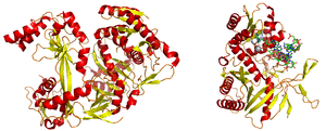 The active components of an RNA-induced silencing complex (RISC) are endonucleases called argonaute proteins, which cleave the target mRNA strand complementary to their bound siRNA.[6] As the fragments produced by dicer are double-stranded, they could each in theory produce a functional siRNA. However, only one of the two strands, which is known as the guide strand, binds the argonaute protein and directs gene silencing. The other anti-guide strand or passenger strand is degraded during RISC activation.[37] Although it was first believed that an ATP-dependent helicase separated these two strands,[38] the process proved to be ATP-independent and performed directly by the protein components of RISC.[39][40] However, an in vitro kinetic analysis of RNAi in the presence and absence of ATP showed that ATP may be required to unwind and remove the cleaved mRNA strand from the RISC complex after catalysis.[41] The guide strand tends to be the one whose 5' end is less stably paired to its complement,[42] but strand selection is unaffected by the direction in which dicer cleaves the dsRNA before RISC incorporation.[43] Instead, the R2D2 protein may serve as the differentiating factor by binding the more-stable 5' end of the passenger strand.[44]
