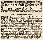 The newspaper was founded as the Ordinari Post Tijdender (meaning "Regular Mail Times" in English) in 1645[1][4][5] by Queen Christina and Chancellor Axel Oxenstierna. The paper was published weekly during early years.[4] Nine years earlier, the royal postal agency (Kungliga Postverket) had been established and now all postmasters in the country were required to submit reports of information they heard, and the newspaper was then distributed to public notice boards throughout the country.[6] In 1791, Gustav III designated the Swedish Academy to distribute and publish the newspaper, a practice that continues today. In 1821 it merged with the Inrikes Tidningar ("Domestic Times") to form the Post- och Inrikes Tidningar.[7]