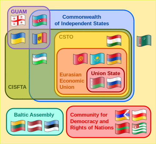 The post-Soviet states, also known as the former Soviet Union (FSU),[1] the former Soviet Republics and in Russia as the near abroad (Russian: бли́жнее зарубе́жье, romanized: blizhneye zarubezhye), are the 15 sovereign states that emerged and re-emerged from the Union of Soviet Socialist Republics following its breakup in 1991, with Russia being the primary de facto internationally recognized successor state to the Soviet Union after the Cold War while Ukraine, by law, proclaimed that it is a state-successor of both the Ukrainian SSR and the Soviet Union which remained under dispute over formerly Soviet-owned properties.[2][3][4] The three Baltic states were the first to declare their independence, between March and May 1990, claiming continuity from the original states that existed prior to their annexation by the Soviet Union in 1940.[5][6] The remaining 12 republics all subsequently seceded.[5] 12 of the 15 states, excluding the Baltic states, initially formed the CIS and most joined CSTO, while the Baltic states focused on European Union and NATO membership.