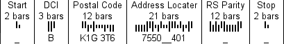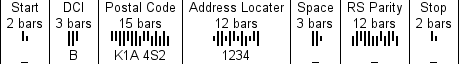 On the other hand, PostBar format D52.01, as described in and shown here, encodes the Postal Code using only twelve bars and an unknown symbology. It encodes nine alphanumerics in the Address Locater field using twenty one bars and another unknown symbology. It does not include any fields for space characters, but it does include twelve bars for Reed-Solomon error correction for a total count of fifty two bars.