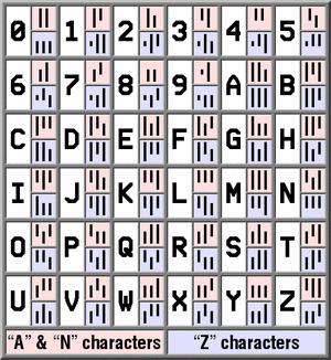 A characters have a somewhat peculiar encoding. They can also be decoded as three base-3 digits (a leading 3 is never used), with the values 2–26 mostly encoding A–Y. Exceptions are that 0 encodes M, 1 encodes H, 9 encodes Z (rather than H), and code 14 is not used (rather than encoding M).