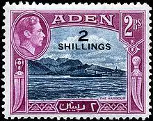 In 1951, the definitive issue of 1939 was overprinted with shilling denominations when the British East African shilling replaced the Indian rupee as the legal currency of Aden.